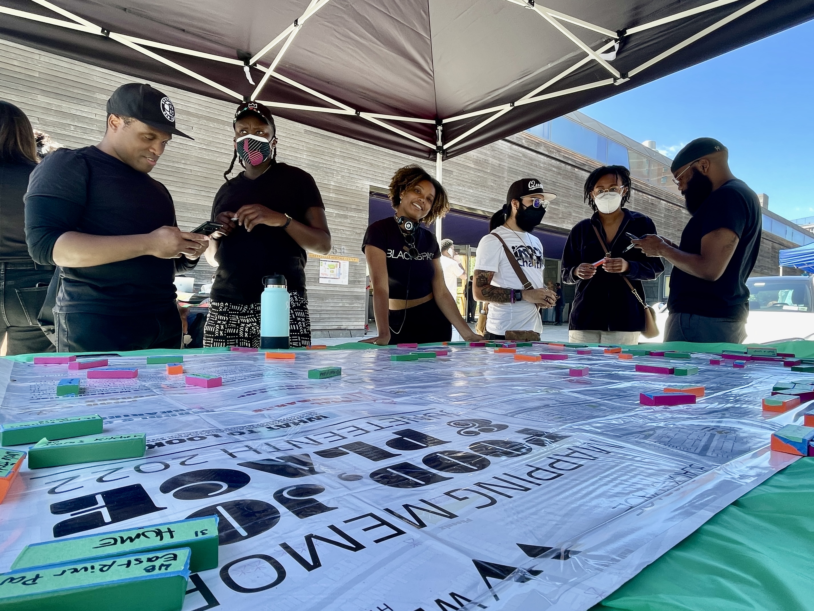 As with most of my work, community input was the key to new knowledge production. So, we created a space where community members could reflect on the connections between food, place, and Black identities throughout the diaspora. These individual experiences (hand-written on colored wooden blocks and placed on the map) imbued the map with a layer of information that cannot be found in government-compiled GIS databases.