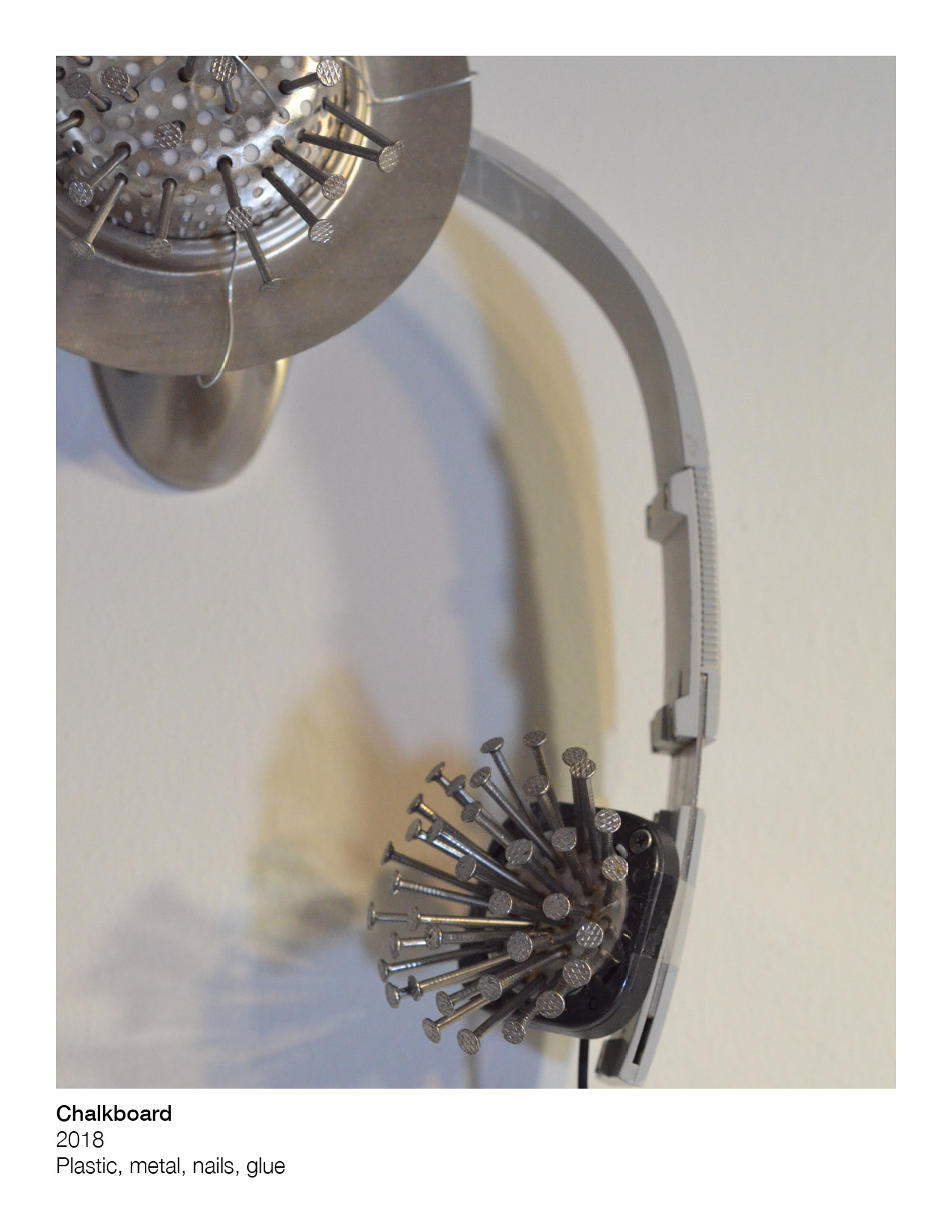 My more discreet sculptural works meditate on what can still be private. Can we make ourselves subvert a public object’s symbolic purpose, I’ve been doing the same with my personal household items. This series juxtaposes the idiosyncrasies of how I use utilitarian items in private with the external expectations of how they should be used in public. Maybe wearing headphones the proper way feels like nails in my ears (“Chalkboard”), and I do it anyway to conform. But by calling out the absurdity of our need to conform in public with equally absurd devices, I am also referencing a future where the adjustments we make to avoid misreading or marginalization are no longer necessary.